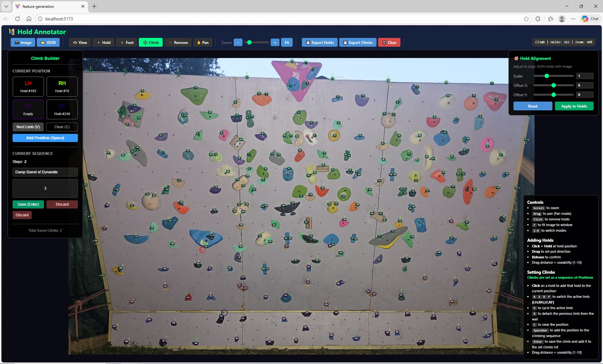 The first challenge in training a model to set climbs for my home-wall was figuring out how to encode my holds. My wall is about as custom as custom gets, with a smattering of holds across a continuous space. That means that I’d likely have to add the holds manually. With that in mind, I whipped up a data-ingestion UI (with the help of Claude Opus 4.5) which allowed me to encode my wall’s holds manually, using my homewall’s Stokt image as a coordinate background.