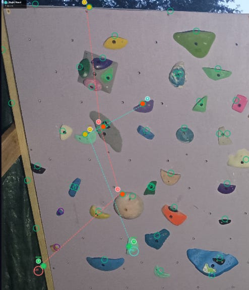 Note that I sometimes added multiple ‘virtual holds’ to one physical hold (e.g. the grey pinch with the black thumb-catch has three ‘virtual’ holds marked on it). This is done to indicate to the model that a hold can be used in different ways, each of which might be useful in a different body position. When I was finished, I had 263 “virtual” holds.