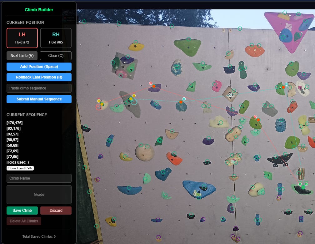 The climb-setting UI was a lot trickier to get right. The original route-setting UI kept track of all four limbs in each position, with each limb mapped to a hold index, and -1 encoding that the limb wasn’t used. This later proved problematic for training, so I created a simpler version using hands only. Positions were added one-at-a-time to the currentClimb, which would then be saved into the ‘climbs’ state. Once I was done adding climbs, I exported ‘climbs’ into climbs.json.
