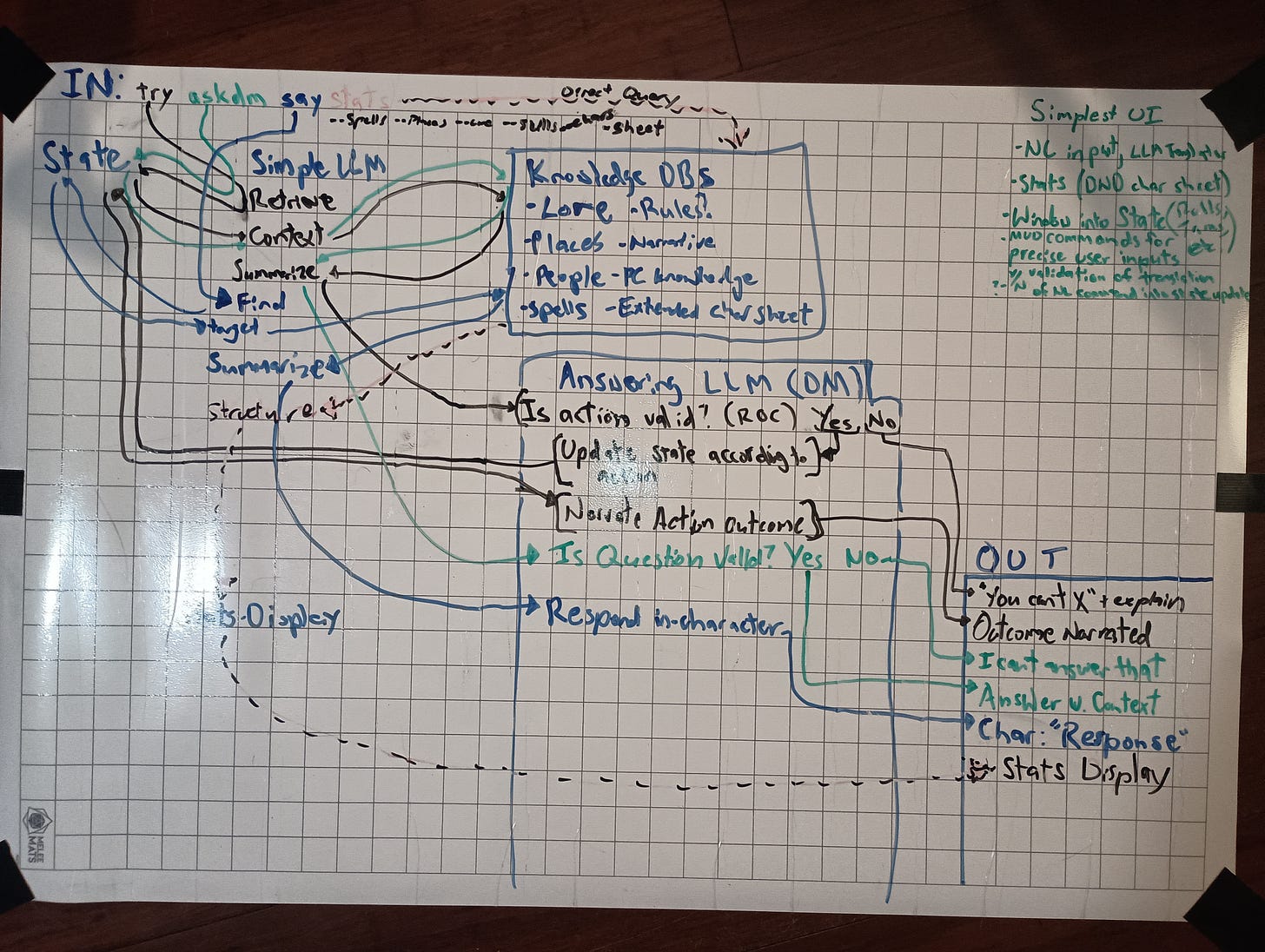 Large state quickly becomes un-manageable LLM context. The issue is that the LLM has to understand not only what’s going on in natural-language, but also how to translate that natural-language into state. After all, what’s going to translate the natural-language update into an update in state? An LLM. Once I understood how daunting it would be to translate State into context, I scrapped the Graph-Vector and SQL databases. Even the GameState alone, describing just the room the PC is in and his nearest enemies, became a massive JSON tree that was a headache for Mistral-7b to understand.