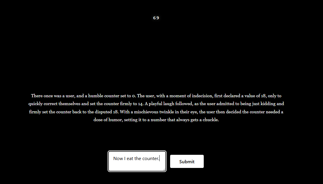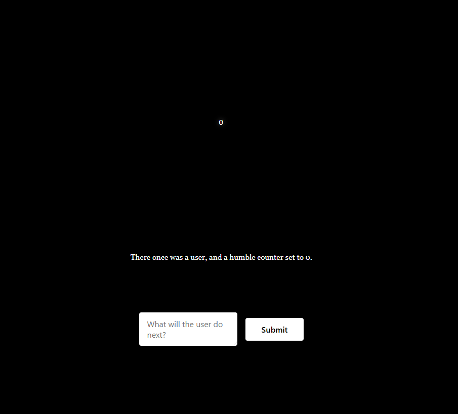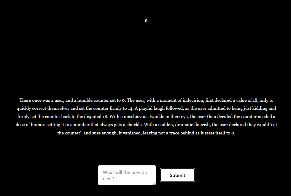 Updating a single counter is a classic showcase in React. What makes this counter special is how it gets updated. Your input gets routed through a prompt augmenter to Gemini-2.5-flash, which updates the counter based on your input. Gemini also returns an ongoing story about the user and their humble counter. This allows for some nice flexibility with regards to what can be done with the counter.