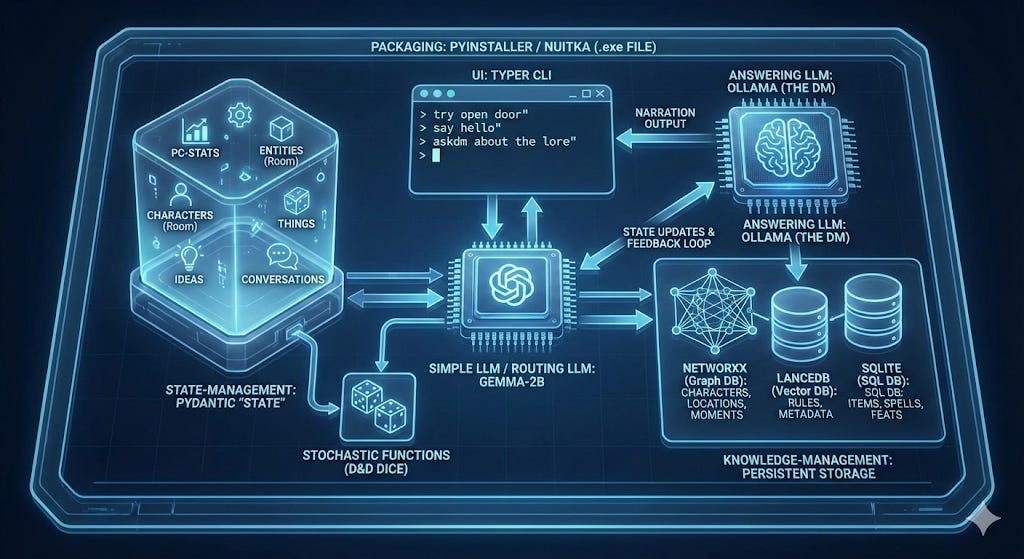 A Graph DB and a separate Vector DB for lore snippets (plot, characters, relationships, etc.) and general game rules. (LanceDB and NetworkX)