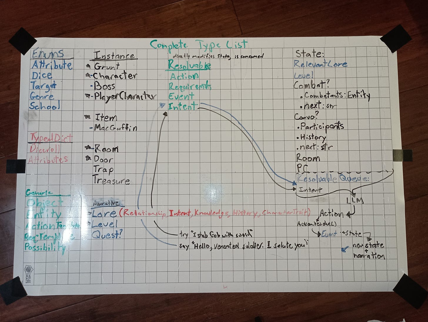 Auto-dungeon was my grandiose attempt at designing such a creation. Auto-dungeon would be a text-based adventure game in the vein of D&D 2e dungeon-crawls, using an LLM-powered engine to interpret the player’s actions, update the game state accordingly, and narrate the outcomes back to the player as new story beats.